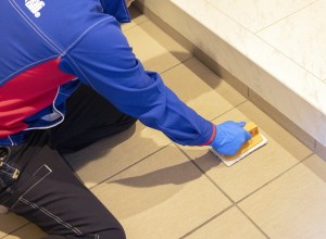 1.施工範囲外を養生した後、玄関まわりを簡易清掃してクリーニングします。